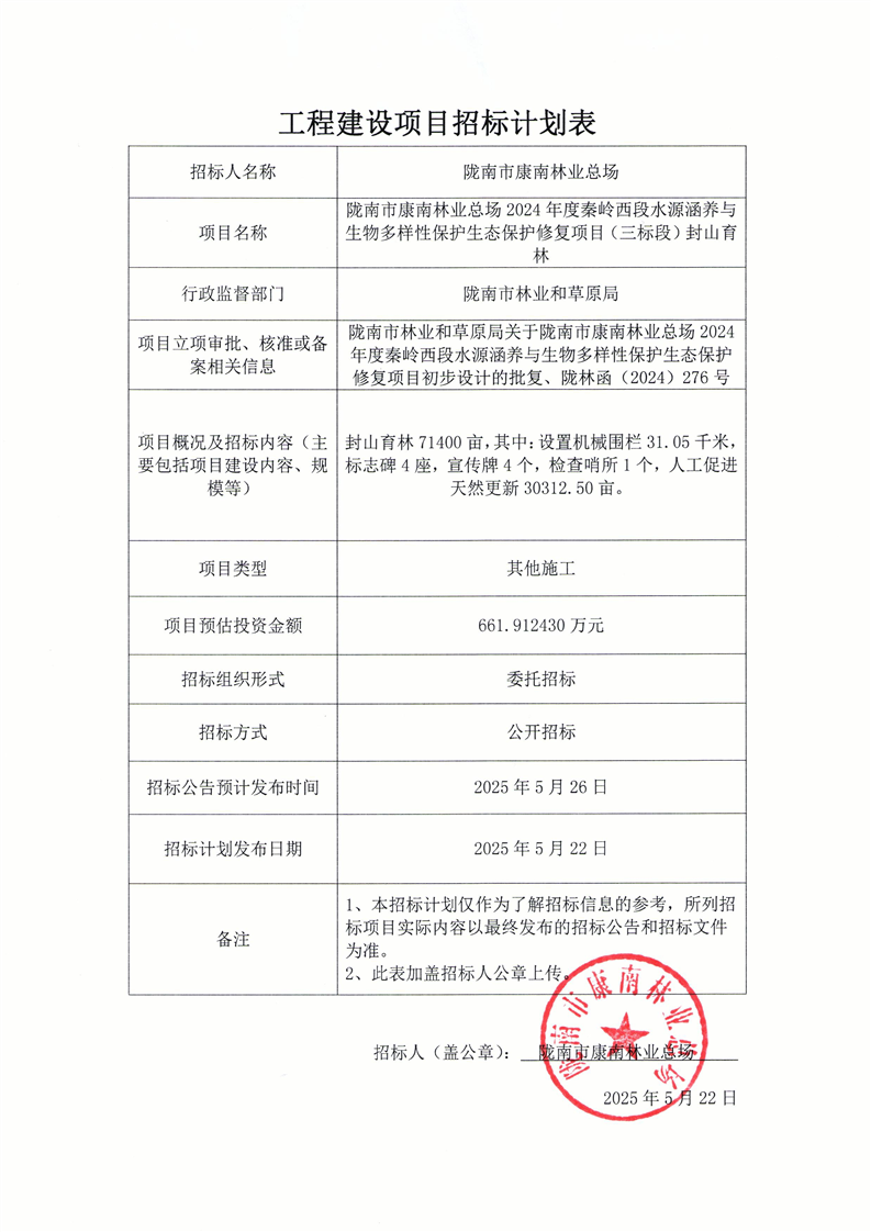 隴南市康南林業(yè)總場2024年度秦嶺西段水源涵養(yǎng)與生物多樣性保護生態(tài)保護修復(fù)項目(三標段)封山育林