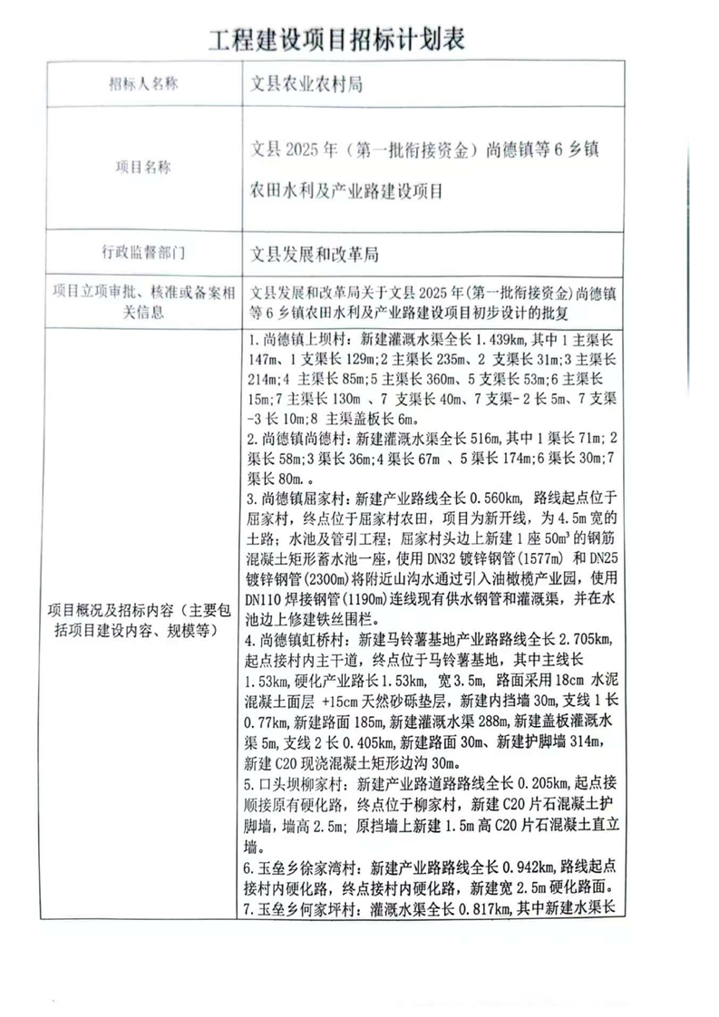 文縣2025年(第一批銜接資金)尚德鎮(zhèn)等6鄉(xiāng)鎮(zhèn)農(nóng)田水利及產(chǎn)業(yè)路建設(shè)項(xiàng)目