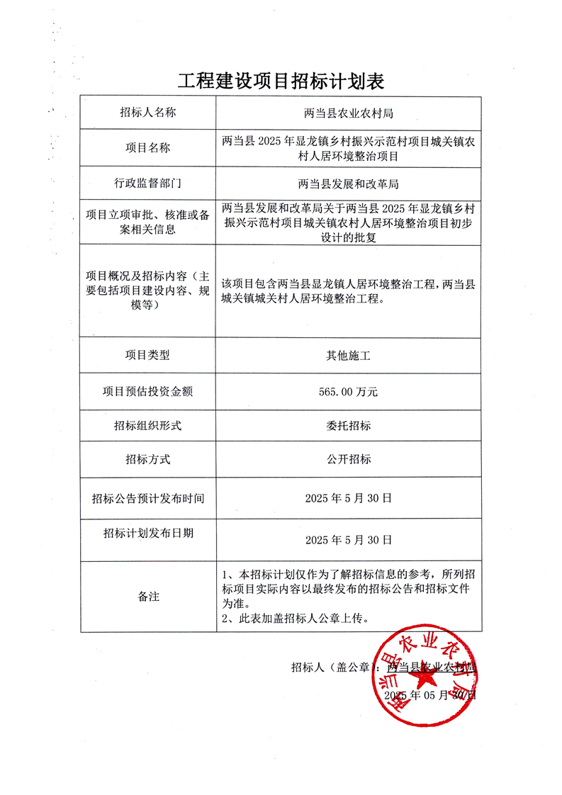 附件:招標計劃表兩當縣2025年顯龍鎮(zhèn)鄉(xiāng)村振興示范村項目城關(guān)鎮(zhèn)農(nóng)村人居環(huán)境整治項目.pdf
