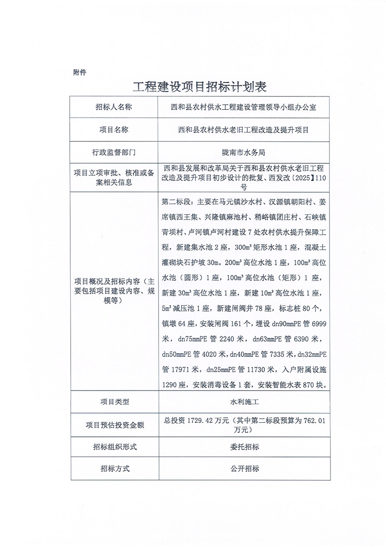 西和縣農(nóng)村供水老舊工程改造及提升項(xiàng)目