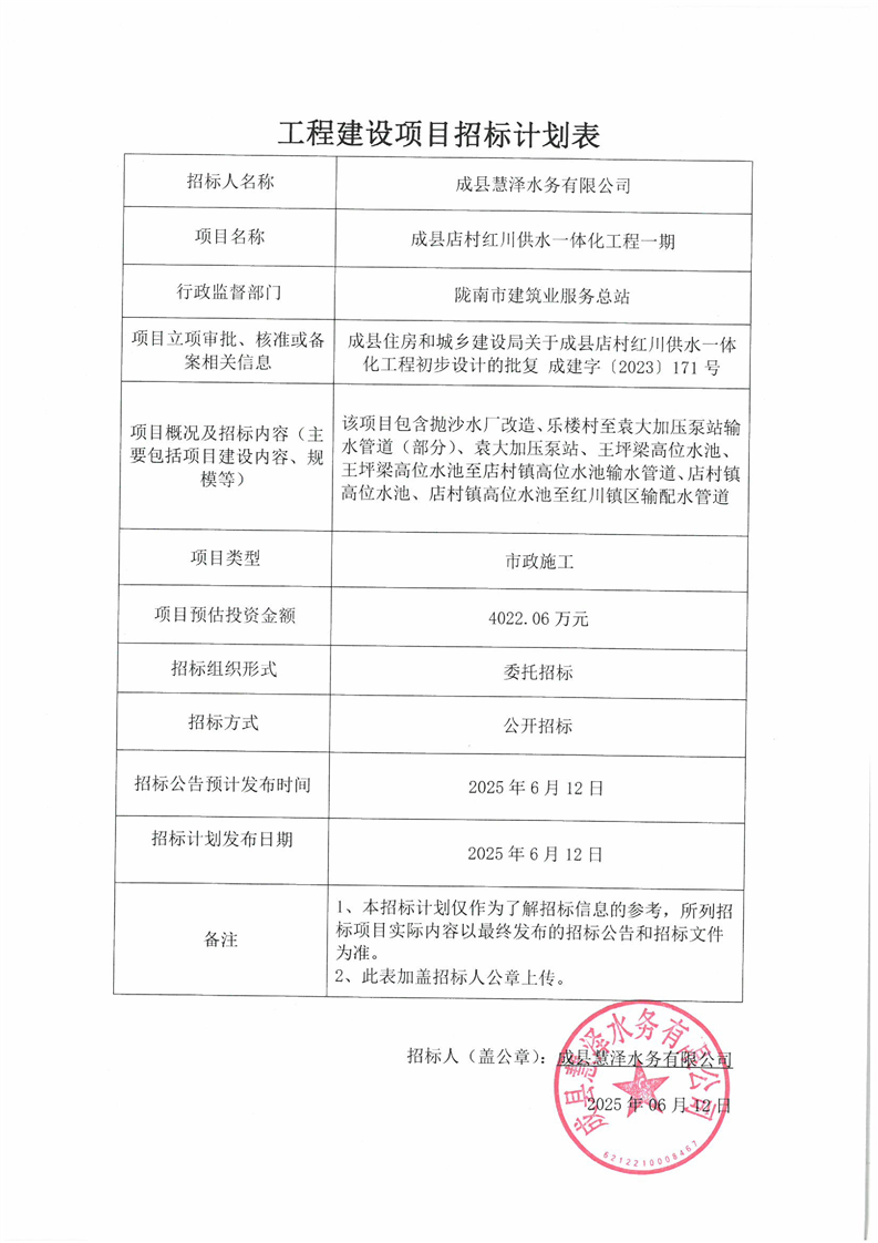 工程建設(shè)項目招標計劃表成縣店村紅川供水一體化工程一期.pdf