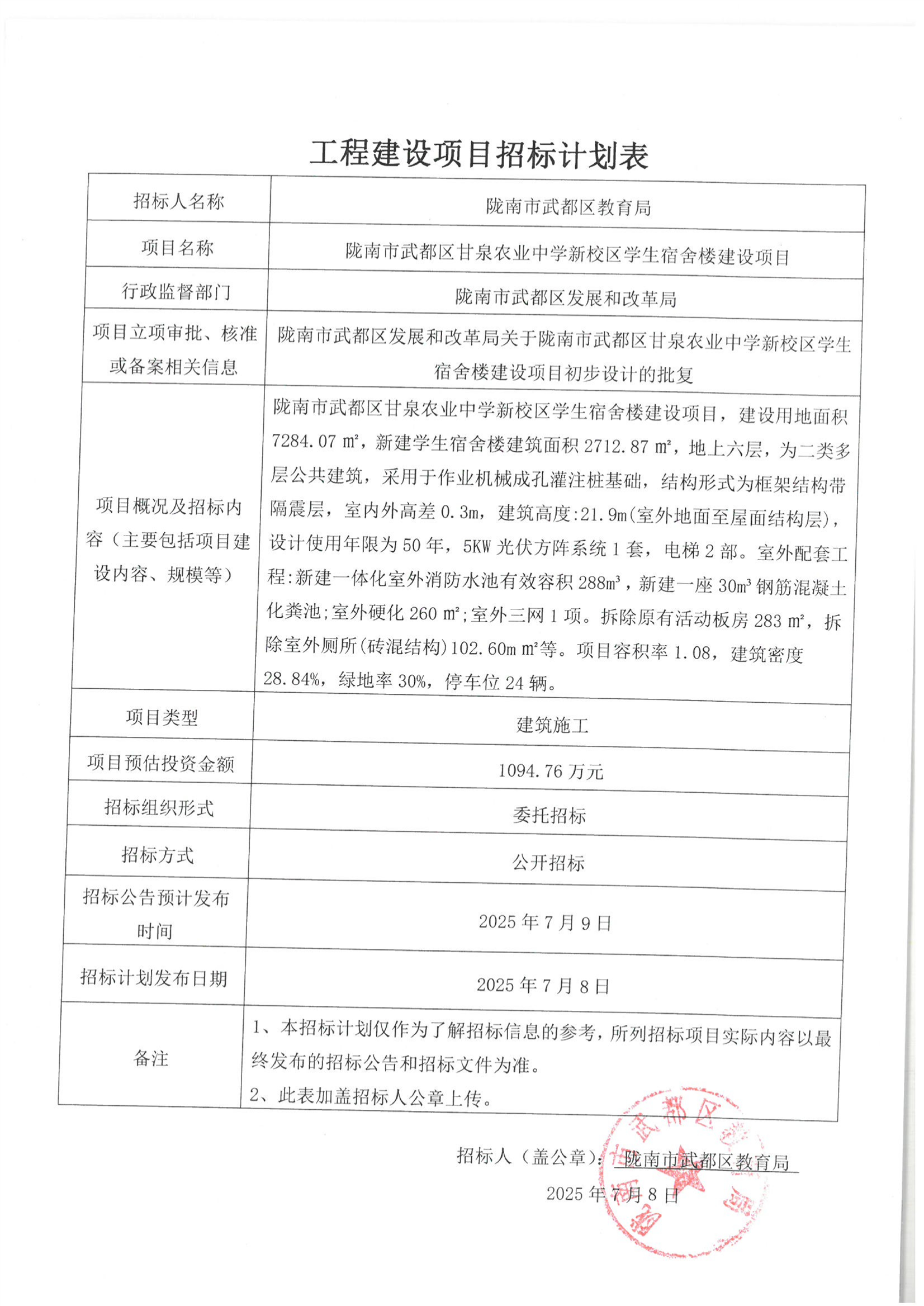 隴南市武都區(qū)甘泉農(nóng)業(yè)中學(xué)新校區(qū)學(xué)生宿舍樓建設(shè)項(xiàng)目