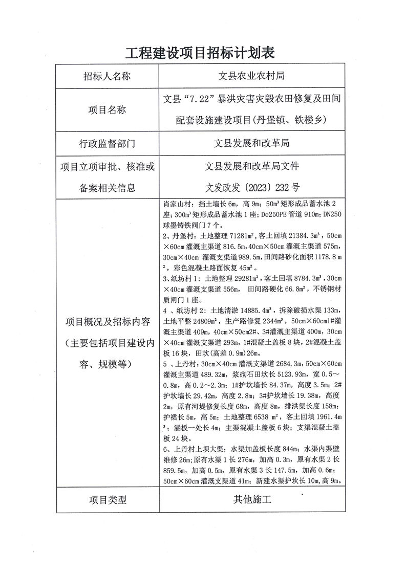 文縣“7.22”暴洪災害災毀農田修復及田間配套設施建設項目(丹堡鎮(zhèn)、鐵樓鄉(xiāng))