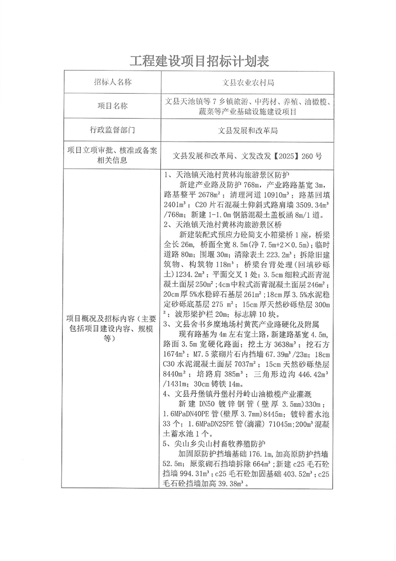 文縣天池鎮(zhèn)等7鄉(xiāng)鎮(zhèn)旅游、中藥材、養(yǎng)殖、油橄欖、蔬菜等產(chǎn)業(yè)基礎(chǔ)設(shè)施建設(shè)項目