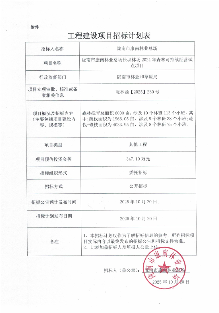 隴南市康南林業(yè)總場(chǎng)長(zhǎng)壩林場(chǎng)2024年森林可持續(xù)經(jīng)營(yíng)試點(diǎn)項(xiàng)目