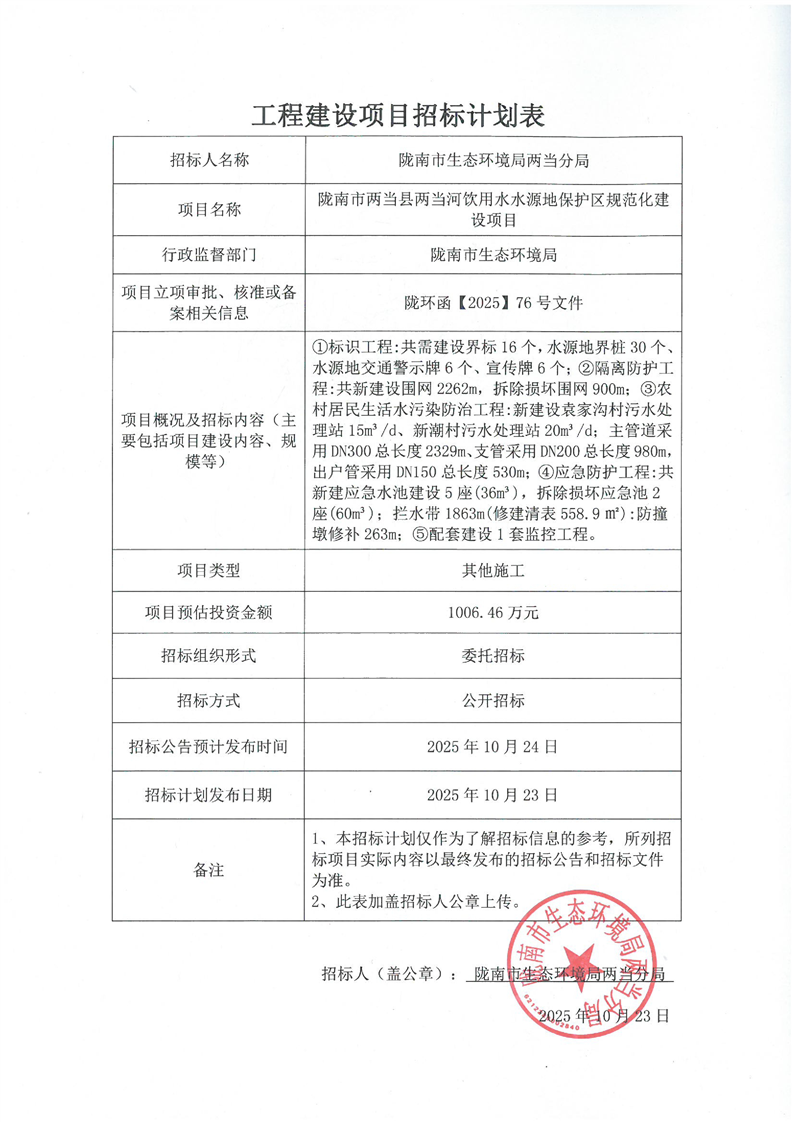 隴南市兩當縣兩當河飲用水水源地保護區(qū)規(guī)范化建設項目