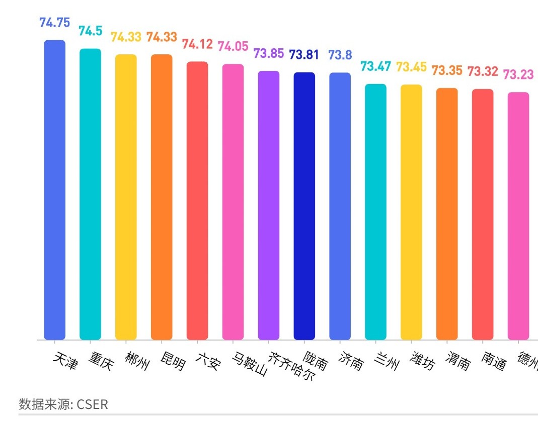 天津74.75,重慶74.5,濟南73.8,西安73.15,青島73.03,成都72.56,上海72.5,深圳72.19,沈陽71.87,杭州70.71,北京70.5,長春70.43,廣州69.36,寧波69.07,武漢69.02,哈爾濱68.48,大連67.34,南京66.81,廈門64.32。