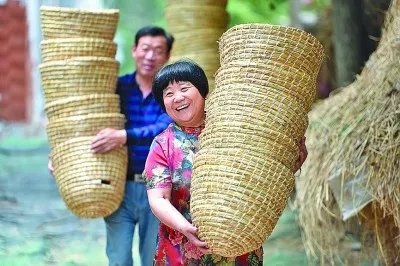 山東臨沂市郯城縣馬頭鎮(zhèn)草編合作社社員在搬運(yùn)用秸稈編制的工藝品