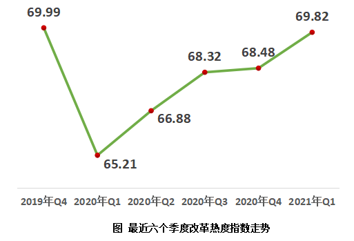 4月21日,中國經(jīng)濟(jì)體制改革研究會在京發(fā)布《2021年第一季度改革熱度第三方評估報告》。報告顯示,2021年第一季度改革熱度指數(shù)為69.82,比上一季度增加1.34,連續(xù)4個季度保持穩(wěn)定回升態(tài)勢;比去年同期增加4.61,已經(jīng)基本接近疫情前2019年第4季度69.99的水平。