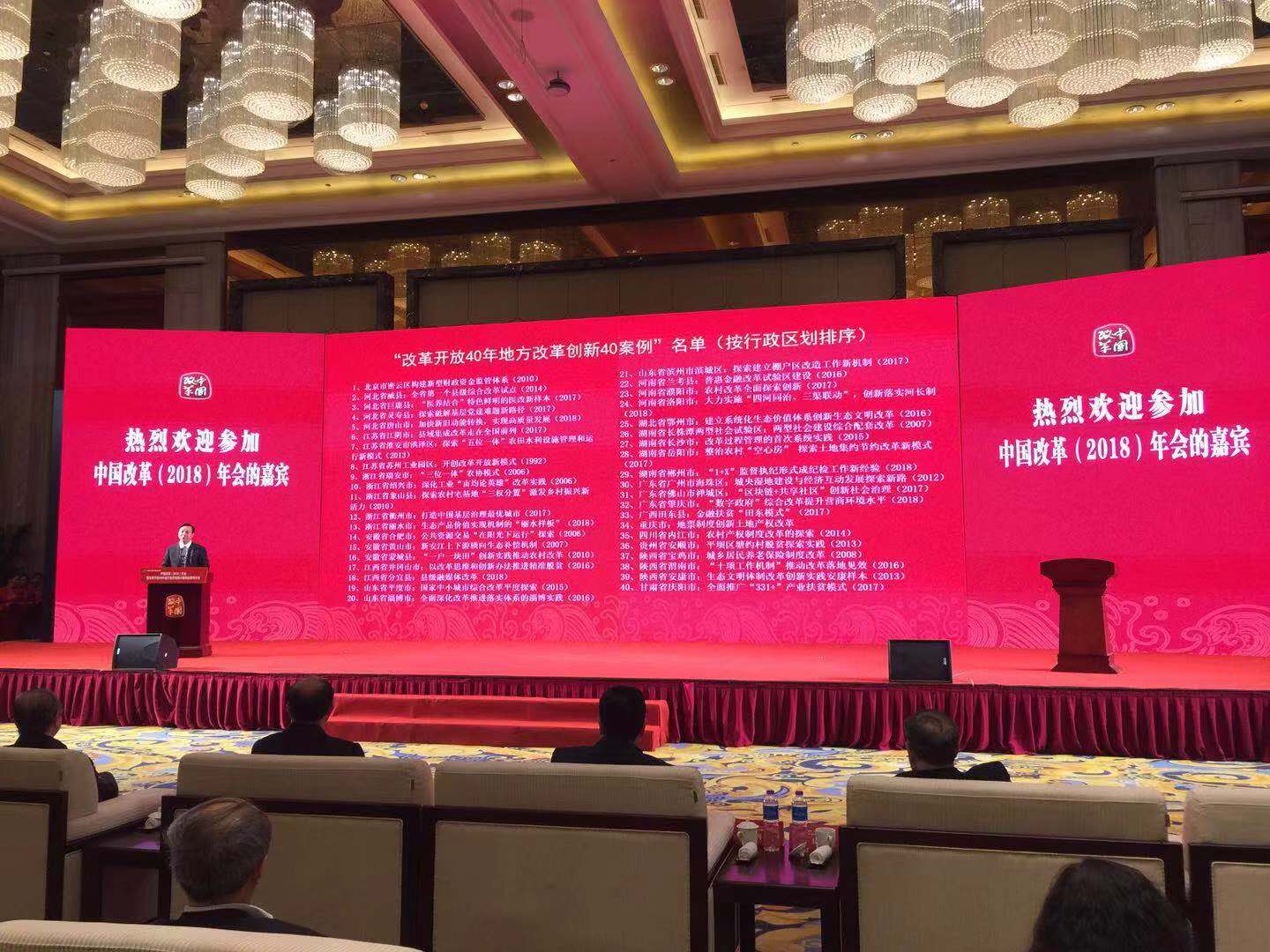 為響應(yīng)中央關(guān)于慶祝改革開放40年號(hào)召,貫徹習(xí)近平總書記在慶祝改革開放40周年大會(huì)重要講話精神,中國經(jīng)濟(jì)體制改革雜志社舉辦的“改革開放40年地方改革創(chuàng)新40案例”(簡稱“40年40案例”)征集活動(dòng)于12月27日在江蘇省江陰市舉辦的“中國改革(2018)年會(huì)”上,揭曉最終名單。180多位來自全國20多個(gè)省區(qū)市的各級(jí)改革部門負(fù)責(zé)人參加了發(fā)布會(huì)議。“改革開放40年地方改革創(chuàng)新致敬案例”名單同時(shí)發(fā)布。
