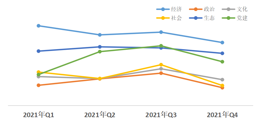 從近幾個(gè)季度的評(píng)估結(jié)果來看,除經(jīng)濟(jì)、生態(tài)領(lǐng)域,其他領(lǐng)域熱度值均在第三季度達(dá)到2021年度熱度指數(shù)峰值,但隨后呈下降趨勢。經(jīng)濟(jì)領(lǐng)域熱度值領(lǐng)先其他領(lǐng)域,政治領(lǐng)域改革熱度值偏低;社會(huì)、政治、黨建領(lǐng)域降幅較大。