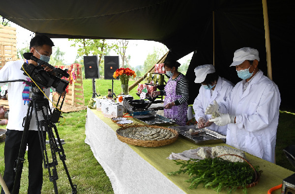 圖為近日安徽省肥西縣柿樹崗鄉(xiāng)村民通過“云上”直播制作當(dāng)?shù)靥厣朗?。新華社記者 劉軍喜 攝
