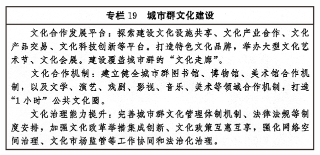 加強區(qū)域文化協(xié)同創(chuàng)新,健全合作互助、扶持補償機制,推動東部地區(qū)以創(chuàng)新引領文化發(fā)展,加大力度支持中西部地區(qū)以及東北等老工業(yè)基地文化發(fā)展,扶持革命老區(qū)、民族地區(qū)、邊疆地區(qū)文化發(fā)展,形成相互促進、優(yōu)勢互補、融合互動的區(qū)域文化發(fā)展格局。圍繞京津冀協(xié)同發(fā)展、長江經(jīng)濟帶發(fā)展、粵港澳大灣區(qū)建設、長三角一體化發(fā)展、黃河流域生態(tài)保護和高質(zhì)量發(fā)展等區(qū)域重大戰(zhàn)略,健全推進區(qū)域內(nèi)文化協(xié)同發(fā)展機制,提升公共文化設施互聯(lián)互通水平,加強區(qū)域文化產(chǎn)業(yè)帶建設,實現(xiàn)區(qū)域文化建設水平整體提高。促進形成文化產(chǎn)業(yè)發(fā)展新格局,創(chuàng)新城市群文化一體化發(fā)展體制機制,共建高水平合作平臺,加強公共文化服務便利共享。完善以城帶鄉(xiāng)、城鄉(xiāng)融合的文化發(fā)展體制機制,發(fā)揮城市帶動輻射作用,加快城鄉(xiāng)間文化要素雙向流動,形成以點帶面、特色鮮明、優(yōu)勢互補、均衡配置的城鄉(xiāng)文化發(fā)展新格局。