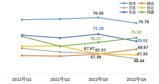 1、從領域來看,政治、黨建領域升幅高于其他領域。第四季度,經(jīng)濟領域74.76,政治領域68.67,文化領域66.44,社會領域67.33,生態(tài)領域70.53,黨建領域71.32。與上一季度相比,政治、黨建領域均有上升,經(jīng)濟、文化、社會、生態(tài)領域下降,生態(tài)領域降幅較大。
