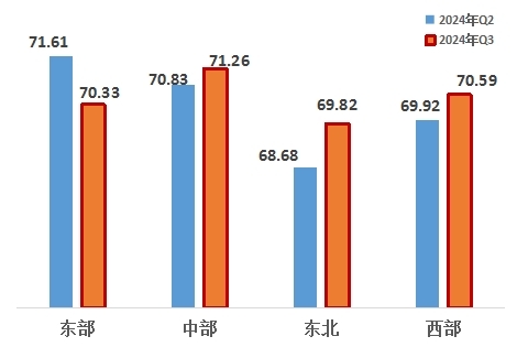 從四大區(qū)域來看,東部、中部、東北、西部地區(qū)分別為70.33、71.26、69.82、70.59,排名分別為中部第一,西部第二,東部第三,東北第四。與上一季度相比,中部、東北、西部地區(qū)改革熱度指數(shù)提升。同比來看,四大區(qū)域均呈現(xiàn)上升趨勢(shì),東北地區(qū)增幅最大。
