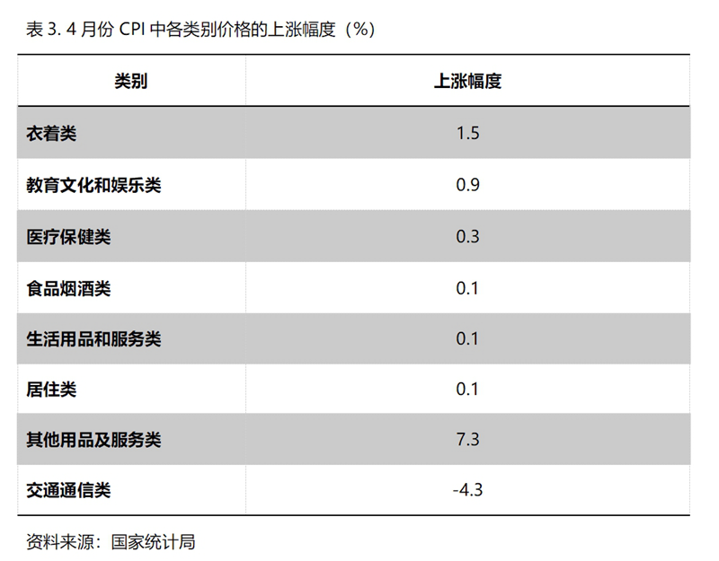 5月份,在CPI 8個類別中有7個類別保持上漲,1個類別下降。上漲的7個類別包括衣著類價格同比上漲1.5%,教育文化和娛樂類上漲0.9%,醫(yī)療保健類上漲0.3%,食品煙酒類上漲0.1%,生活用品及服務類上漲0.1%,居住類上漲0.1%,其他用品和服務類上漲7.3%;下降的雖然就交通通信類1個類別,但降幅較大,5月份同比下降4.3%。
