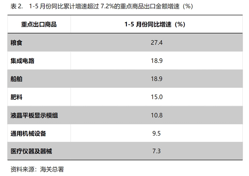 1-5月份,出口金額同比增速超過7.2%的重點商品共有7類,即糧食增長27.4%,集成電路增長18.9%,船舶增長18.9%,肥料出口增長15.0%,液晶平板顯示模組增長10.8%,通用機器設備增長9.5%,醫(yī)療儀器及器械增長7.3%。