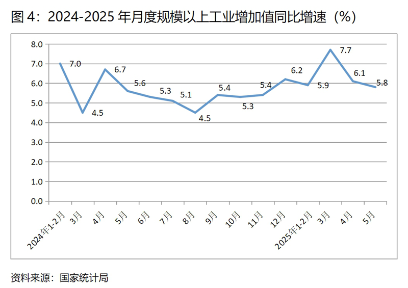 (四)工業(yè)增速持續(xù)回落。5月份,規(guī)模以上工業(yè)增加值同比增長5.8%,比上月增長6.1%回落了0.3個百分點,4月份比3月份回落了1.6個百分點,呈現(xiàn)出兩個月的連續(xù)回落。從工業(yè)三大門類看,主要是制造業(yè)增速回落。5月份采礦業(yè)同比增長5.7%,與上月持平;制造業(yè)增長6.2%,比上月回落0.4個百分點;電力、熱力、燃氣及水生產和供應業(yè)增長2.2%,比上月回升0.1個百分點。5月份工業(yè)增速回落幅度雖然比上月收窄不少,但還是要密切關注回落背后反映出的工業(yè)增長動力未來可能變動的趨勢。