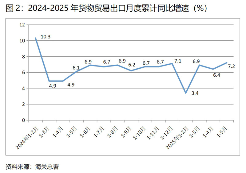 (二)貨物出口增速由落轉升。1-5月份,貨物出口同比增長7.2%,比1-4月份增長6.4%回升0.8個百分點,1-4月份比1-3月份回落0.5個百分點,增速呈現(xiàn)出由落轉升的態(tài)勢。貨物出口對主要貿易出口經濟體增速有升有落,1-5月份對歐盟出口同比增長7.7%,比1-4月份4.9%增速回升2.8個百分點;對美國出口下降8.7%,比1-4月份下降2.5%擴大6.2個百分點;對東盟出口增長13.5%,比1-4月份11.5%增速回升2.0個百分點;對拉丁美洲出口增長10.6%,比1-4月份11.5%增速回落0.9個百分點。盡管5月12日中美發(fā)表聯(lián)合公報同意在90天內暫時調降“對等關稅”中的稅率,但我國對美出口降幅仍出現(xiàn)進一步擴大的趨勢,與整個出口增長加快形成了明顯反差,說明中美貿易關系的復雜性和較大的不確定性。