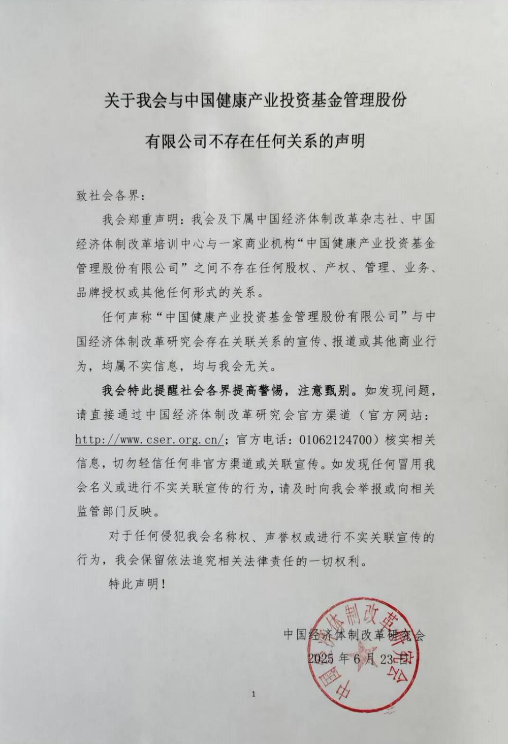 任何聲稱“中國健康產(chǎn)業(yè)投資基金管理股份有限公司”與中國經(jīng)濟體制改革研究會存在關(guān)聯(lián)關(guān)系的宣傳、報道或其他商業(yè)行為,均屬不實信息,均與我會無關(guān)。