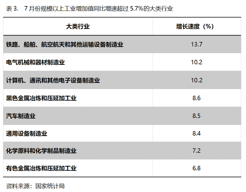 7月份,增長(zhǎng)速度超過(guò)規(guī)模以上工業(yè)增長(zhǎng)5.7%的主要大類行業(yè)共有8個(gè),即鐵路、船舶、航空航天和其他運(yùn)輸設(shè)備制造業(yè)同比增長(zhǎng)13.7%,電氣機(jī)械和器材制造業(yè)增長(zhǎng)10.2%,計(jì)算機(jī)、通訊和其他電子設(shè)備制造業(yè)增長(zhǎng)10.2%,黑色金屬冶煉和壓延加工業(yè)增長(zhǎng)8.6%,汽車制造業(yè)增長(zhǎng)8.5%,通用設(shè)備制造業(yè)增長(zhǎng)8.4%,化學(xué)原料和化學(xué)制品制造業(yè)增長(zhǎng)7.2%,有色金屬冶煉和壓延加工業(yè)增長(zhǎng)6.8%。