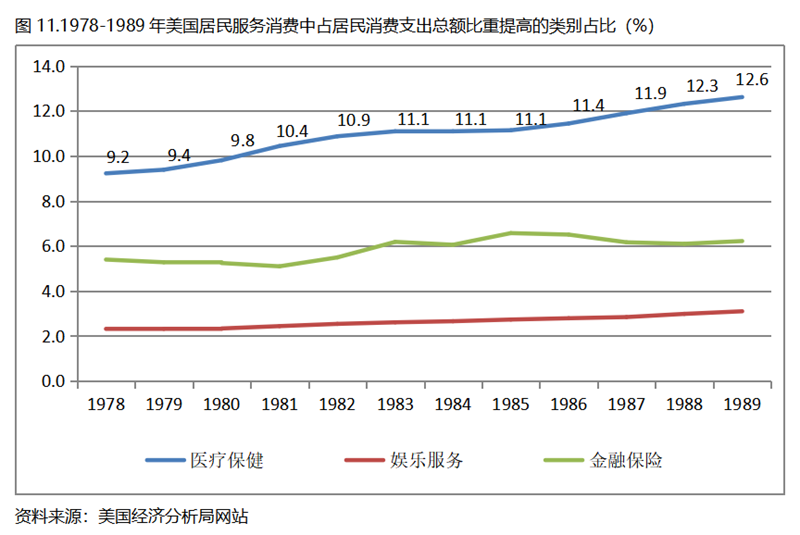 由于數(shù)據(jù)來源的原因,重點(diǎn)將看一下美國居民服務(wù)消費(fèi)類別在人均GDP超過1萬美元后的變化情況。美國居民服務(wù)消費(fèi)共有7個(gè)大類別,在1978-1989年期間占居民消費(fèi)支出總額比重提高的有3個(gè)類別,分別是醫(yī)療保健、娛樂服務(wù)和金融保險(xiǎn),醫(yī)療保健占居民消費(fèi)支出總額的比重提高了3.4個(gè)百分點(diǎn),娛樂服務(wù)和金融保險(xiǎn)占居民消費(fèi)支出總額的比重均提高了0.8個(gè)百分點(diǎn)。