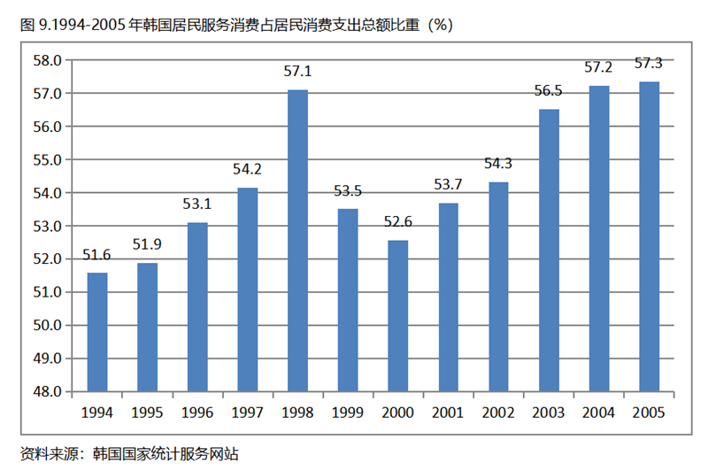 韓國在人均GDP超過1萬美元后的1994-2005年期間,居民服務(wù)消費(fèi)占居民消費(fèi)支出總額在波動中提高,而居民耐用品消費(fèi)占居民消費(fèi)支出總額比重、非耐用品消費(fèi)占居民消費(fèi)支出總額比重要均呈現(xiàn)下降趨勢。