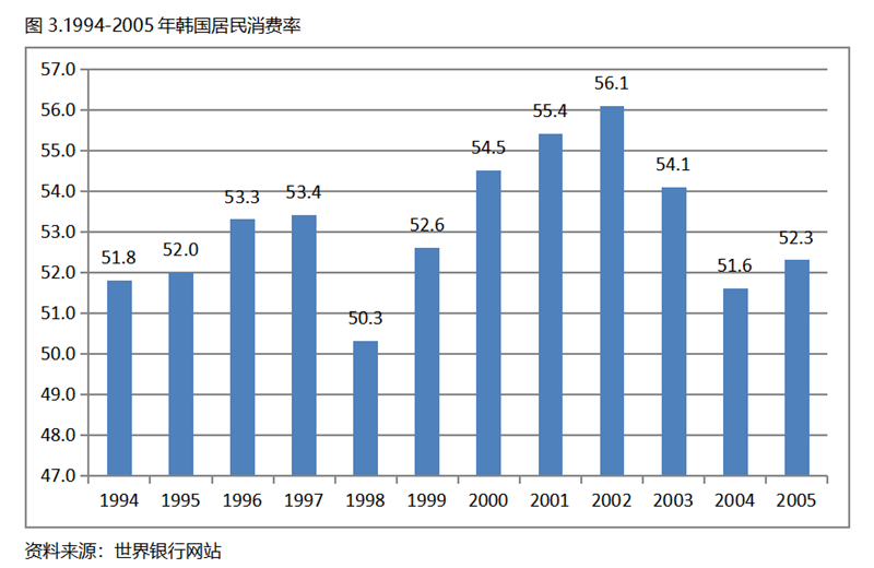 韓國是1994年人均GDP超過1萬美元的,在1994-2005年的12年期間,居民消費(fèi)率也呈現(xiàn)先升后落的走勢,總體上看是在高位上保持著較為穩(wěn)定的態(tài)勢,2005年比1994升0.5個(gè)百分點(diǎn)。