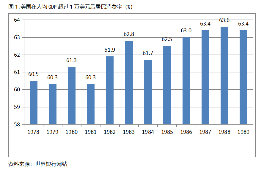 美國在人均GDP超過1萬美元后的12年期間注,居民消費(fèi)率一直保持在60.0%以上,同時(shí)還呈現(xiàn)出總體持續(xù)提高的趨勢(shì)。美國在1978年人均GDP超過1萬美元,當(dāng)年居民消費(fèi)率為60.5%,此后總體保持了持續(xù)提高的態(tài)勢(shì),12年后的1989年提高到63.4%,提高了2.9個(gè)百分點(diǎn)。