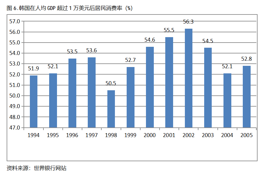 韓國在人均GDP超過1萬美元后的12年期間,居民消費(fèi)率一直保持在50.0%以上,呈現(xiàn)出較長時(shí)間的提高,但后幾年出現(xiàn)小幅的回落。韓國在1994年人均GDP超過1萬美元,當(dāng)年居民消費(fèi)率為51.9%,2002提高到56.3%,隨后出現(xiàn)回落,2005年為52.8%,也就是說,韓國在人均GDP超過1萬美元后的12年期間,居民消費(fèi)率由當(dāng)年的51.9%提高到2002年最高的56.3%,共提高了4.4個(gè)百分點(diǎn)。