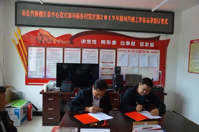 根據(jù)《中共隴南市委組織部關(guān)于扎實做好幫扶單位黨組織與貧困村黨組織結(jié)對攻堅工作的通知》要求,市公共資源交易中心黨支部與武都區(qū)黃坪鎮(zhèn)楊務(wù)村黨支部在4月啟動開展結(jié)對共建活動基礎(chǔ)上,組織召開雙方黨支部結(jié)對共建工作聯(lián)席會,進一步探討和完善結(jié)對共建方案,簽訂了《隴南市公共資源交易中心黨支部與武都區(qū)黃坪鎮(zhèn)楊務(wù)村黨支部2019年結(jié)對共建工作備忘錄》。